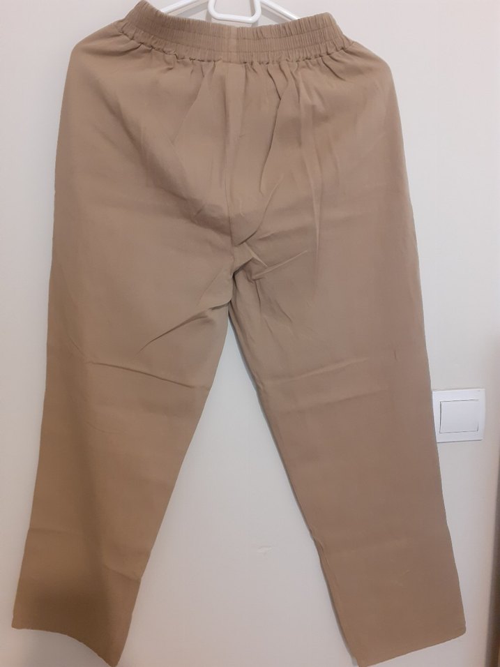 Bej renkli midi boy, regular fit kumaş pantolon, rahat lastikli bel ve düz tasarımla günlük sokak stili için uygundur.