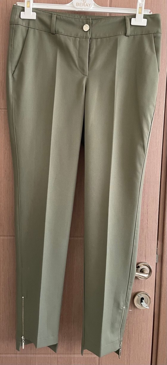 Bej renkli, midi boy, regular fit kadın kumaş pantolon. Yumuşak sentetik kumaştan, fermuarlı detaylı, ofis ve günlük iş ortamına uygun. İki defa giyildi temiz kusursuz