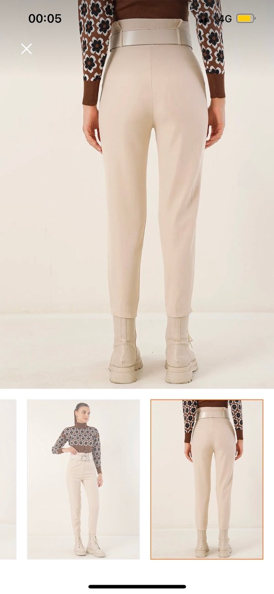 Kadınlar için bej renkli, midi boyda kumaş pantolon. Düzenli kesimi ve sade tasarımıyla günlük kullanıma uygundur.