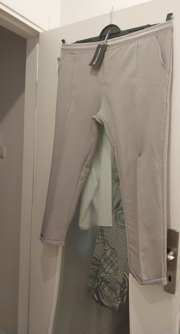 Bej renkli kadın kumaş pantolon, normal boy ve regular fit kesime sahiptir. Yumuşak sentetik kumaştan yapılmış olup günlük kullanım için uygundur.