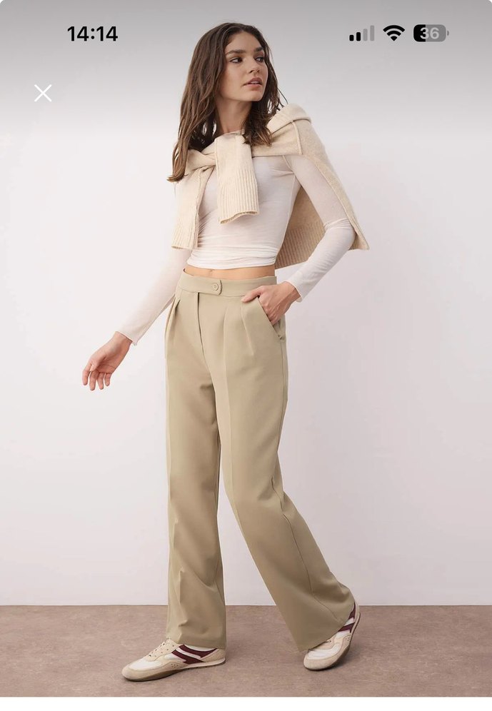 Bej renkte, normal boy midi kumaş pantolon, rahat kesimli ve şık duruşlu, ofis için uygun, hafif sentetik kumaştan üretilmiştir.