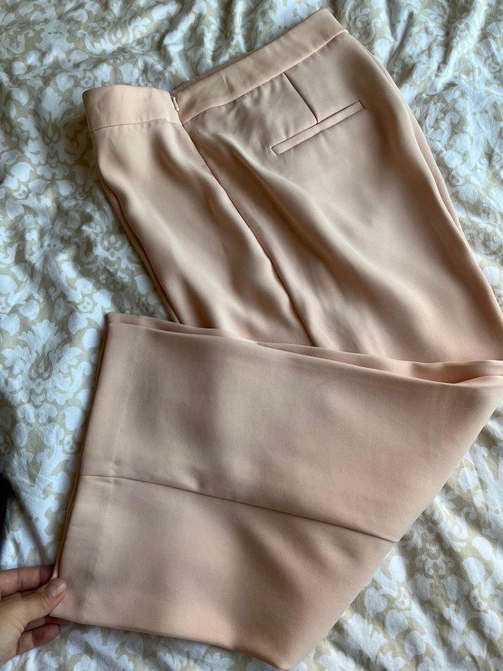 Bej renkli, midi boy, regular fit kadın pantolon. Yumuşak ve ipeksi kumaştan, desensiz, ofis için uygun rahat şıklık sunar.