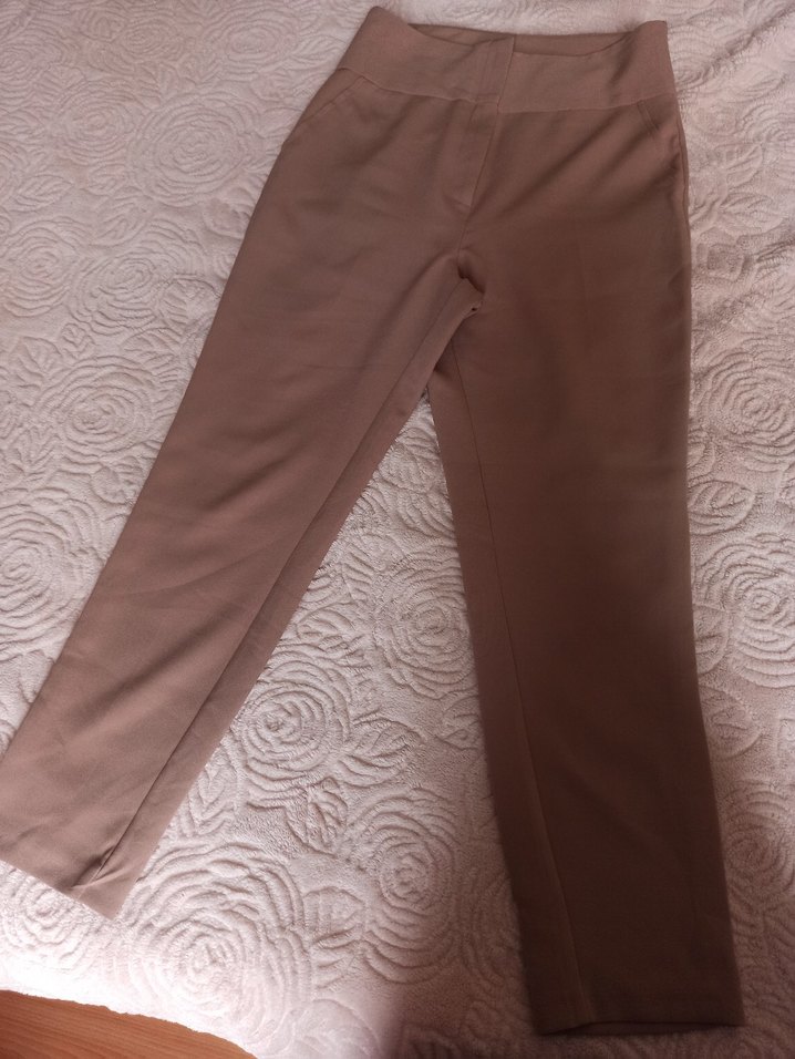 Bej renkli, midi boy, regular fit kumaş pantolon. Düz desensiz, yumuşak sentetik kumaştan üretilmiş, günlük ve iş stiline uygun rahat ve şık.