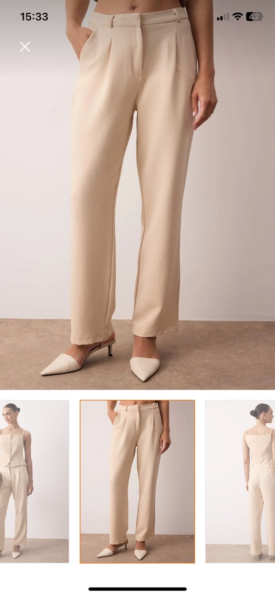 Bej renkli, midi boy, regular fit kadın kumaş pantolon. Minimalist ve çağdaş tasarımıyla ofis için ideal, ipeksi dokulu rahat bir model. ✨