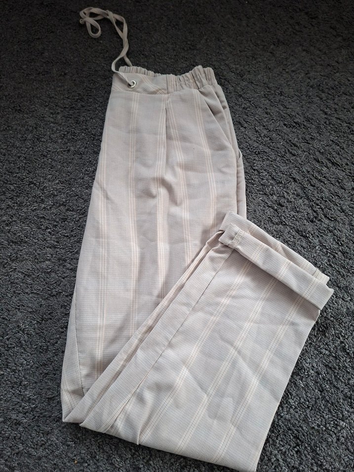 Bej renkli, pilili ve midi boy kadın pantolon. Rahat kesimiyle günlük kullanıma uygundur.Tum boy 86cm,bel çevresi esneyince 86cm,basen çevresi 114cm,tertemizdir