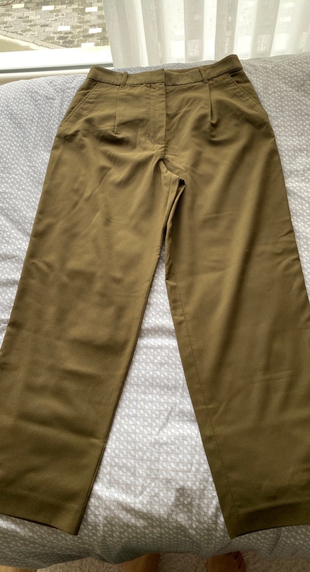 Bej renkli, midi boy kadın pantolon. Normal kesim ve parlak sentetik kumaştan, minimal ve normcore tarzda günlük kullanım için uygun. ✨