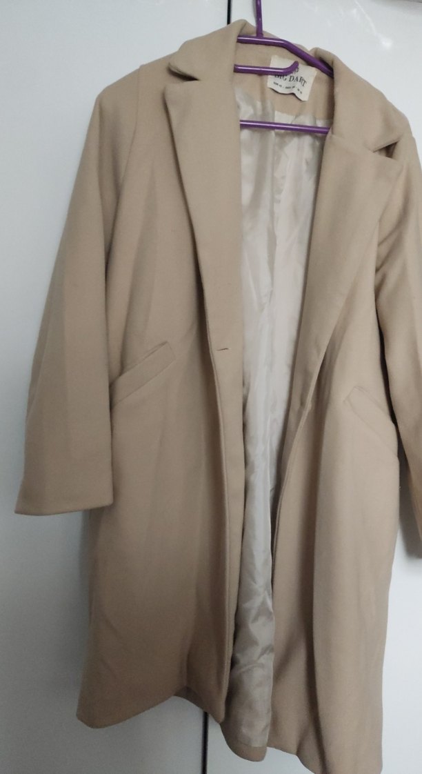 Bej renkte, notched lapel yaka ve uzun kollu kadın midi kaban. Sentetik kumaştan, normal kesim ve desen içermeyen sade tasarım. Ofis için uygun minimal ve normcore stil.
