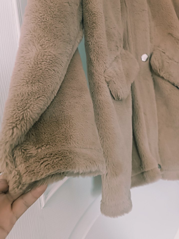 rengi tam bilmiyorum ama sütlü kahve peluş detaylı midi ceket. Notlu yakalı ve uzun kollu, bol kesim rahat bir yapıya sahip. Günlük kullanım için uygundur. kaz tüyü kadar yumuşak marka doğru değil butik ürünüdür