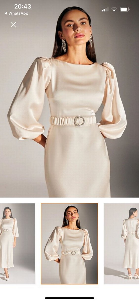 Bej renkte, saten dokulu, kemerli ve uzun kollu midi elbise. Tek renk, tek parça ve klasik şıklık sunar. ✨ 4 saat giyildii sadece trendyoldaki guncel fiyatii 3.300