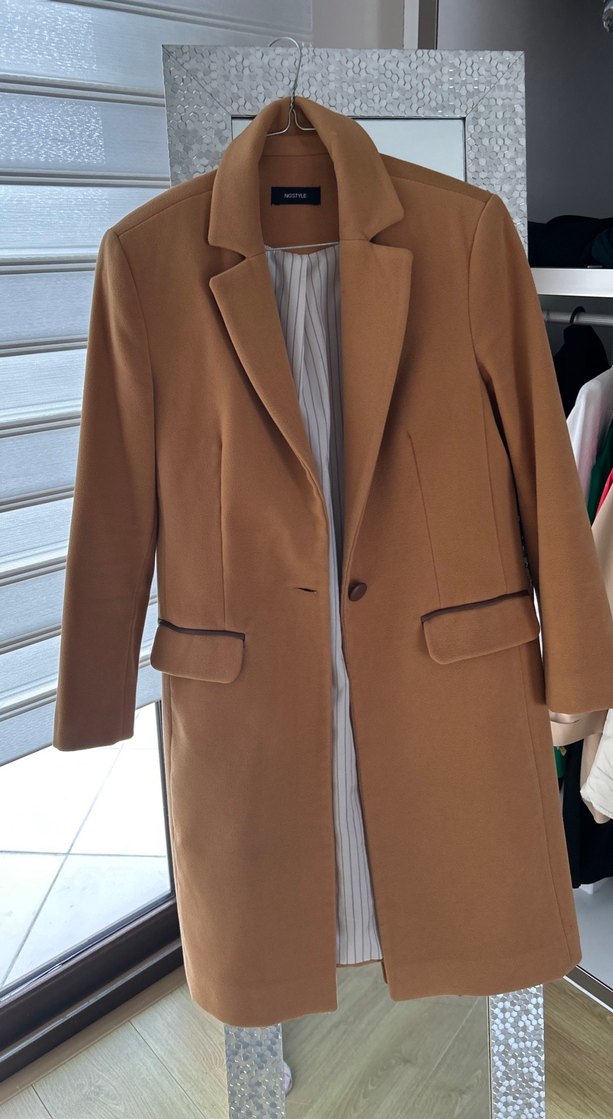 Bej renkli, süet kumaştan yapılmış kadın midi kaban. Düğmeli, uzun kollu ve normal kesim. Ofis ve günlük kullanıma uygun, desen içermeyen şık tasarım.