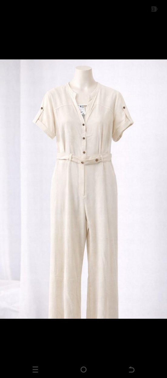 Yumuşak süet kumaştan, bol kesim bej tulum. Kemerli, kısa kollu ve kesimli yakalı, gündelik şıklık için ideal.