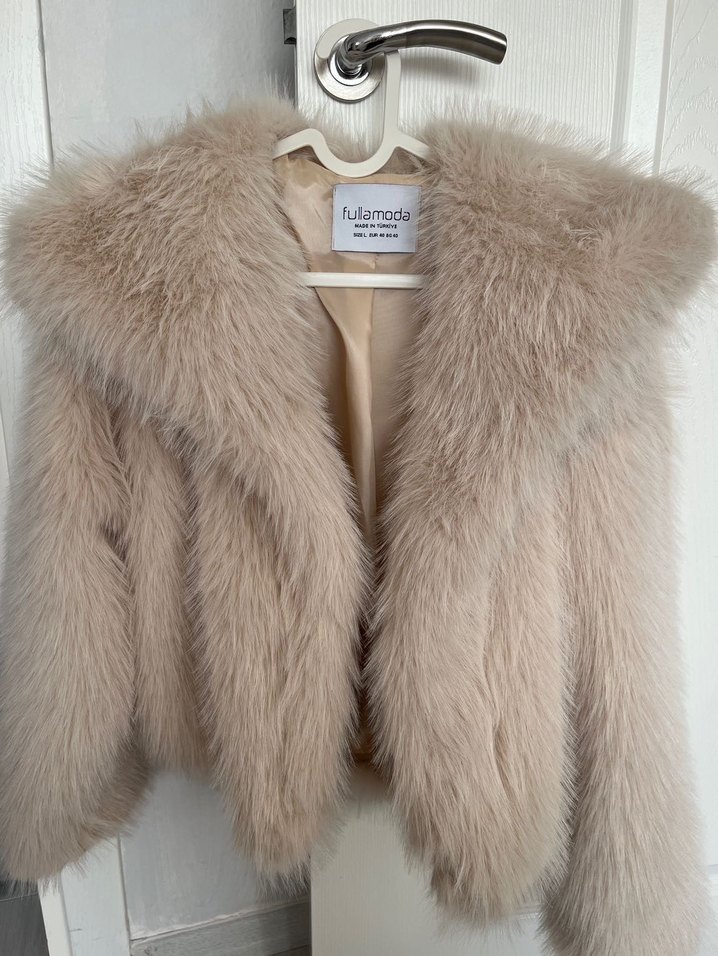 Bej midi boy, suni kürk detaylı, uzun kollu, yakalı ve vücuda oturan klasik Paris tarzı kadın ceketi. Fullamoda markası, ofis için uygun. 0 kullanım
