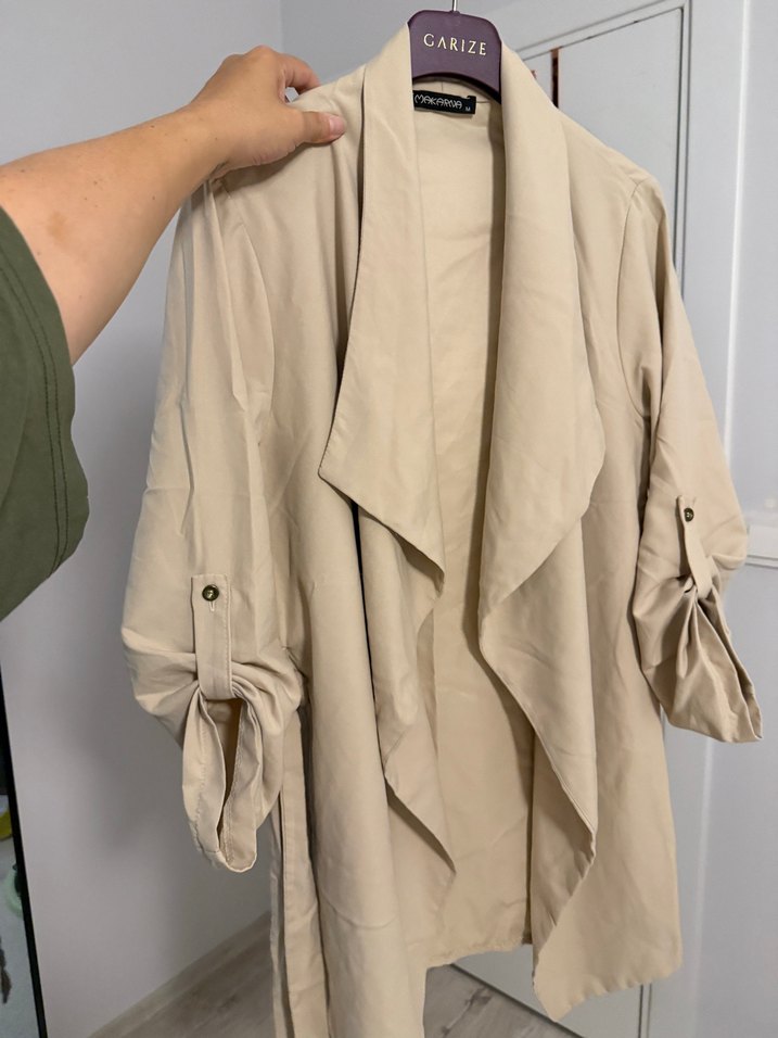Bej renkli, kumaştan, uzun kollu ve bol kesim midi trençkot. Günlük rahat stil için uygundur.