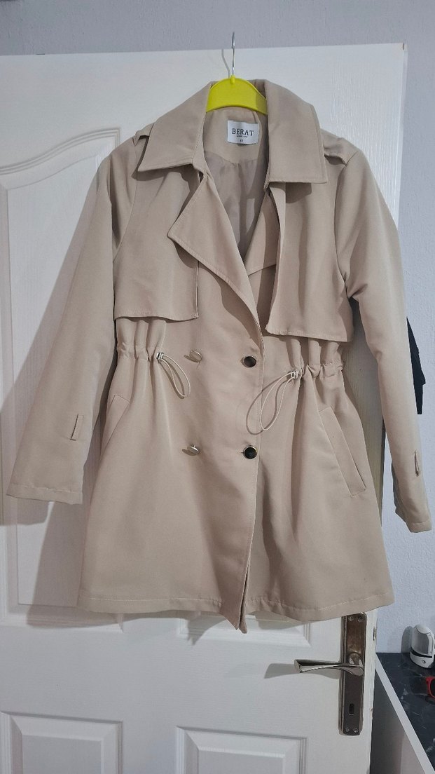 Bej renkte, düğmeli ve kesikli yakalı kadın midi trençkot. Strappy kollu ve regular fit kesimiyle günlük sokak modasına uygun. Marka etiketi 'BERAT'.