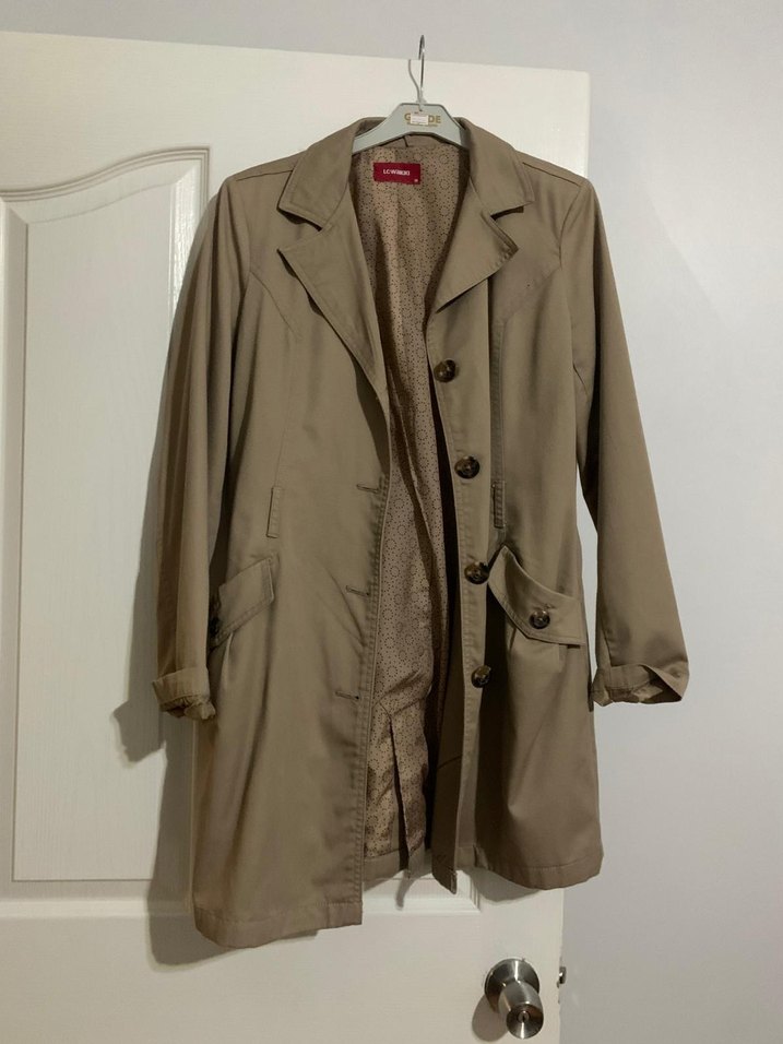 Bej renkte, keten kumaştan, uzun kollu ve düğmeli kadın midi trençkot. Notch yaka ve regular fit ile günlük sokak stiline uygun minimal tasarım. 38 beden arkasında lacivert nokta kadar kalem izi bulunmakta deformesi yok astarlı trençkot