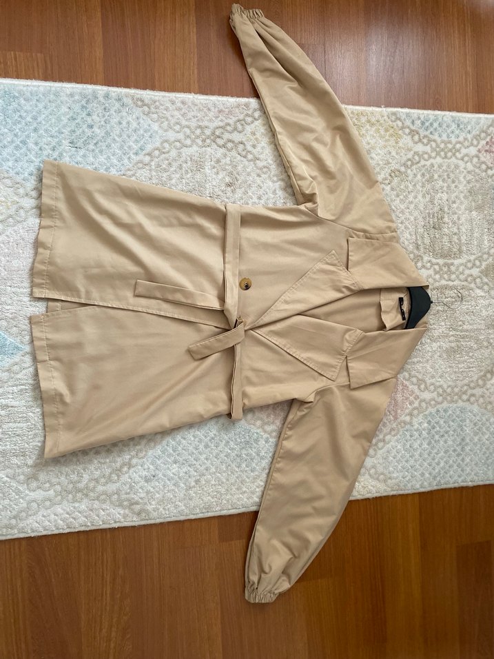 Bej renkte, uzun kollu kadın midi trençkot. Normal kesim ve kuşaklı, günlük sokak stili için uygun. 36 38 bedene uygun