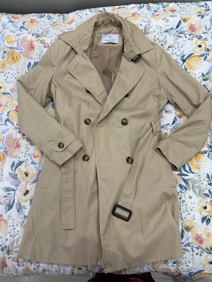 Bej renkte, düğmeli ve çıtçıtlı midi trençkot. Uzun kollu, regular fit, sentetik kumaştan, günlük sokak stili için uygun.