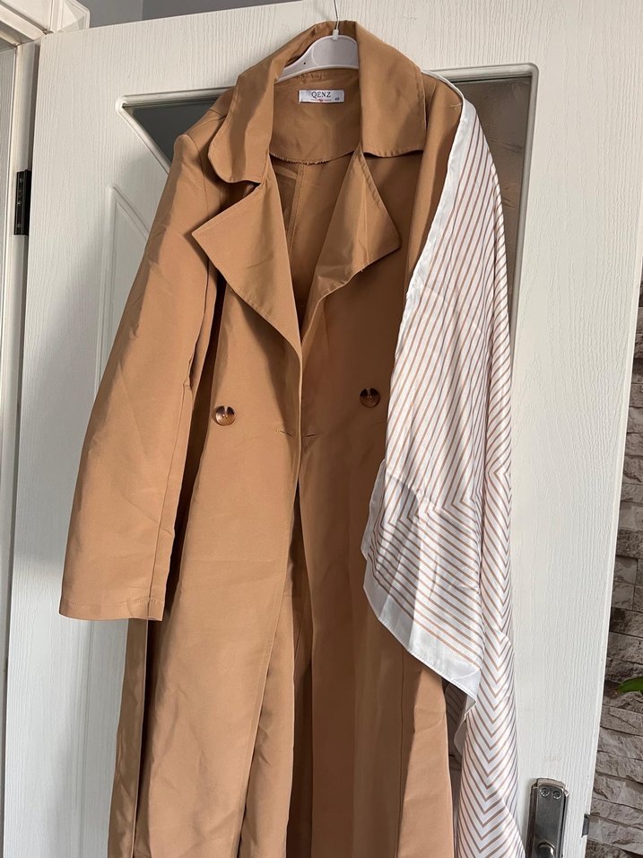 Bej renkli, kemerli ve çıtçıt yakalı kadın midi trençkot. Düz, parlak sentetik kumaştan, regular kesim ve askılı kollarla ofis için uygun. 42 beden astarsız 124 boy örtü detaylı istersen örtüyü çıkartadabilinir hediye alındı olmadı hiç kullanılmadı