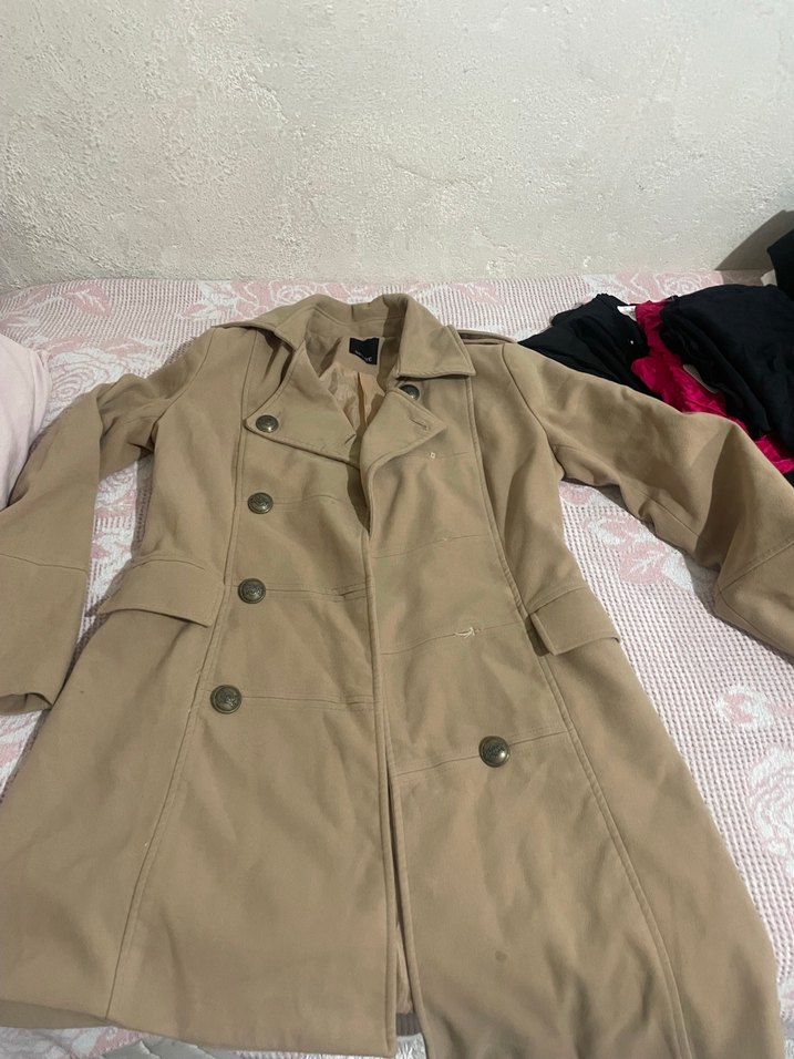 Bej midi trençkot, geniş kesim ve yakalı, uzun kollu, şeffaf detaylıdır. Sentetik kumaştan, sokak stili ve günlük kullanım için uygundur.