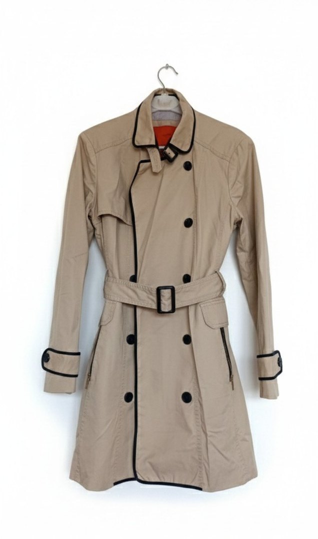 Bej renkli, siyah detaylı, düğmeli, kemerli trençkot. Günlük kullanım için ideal.