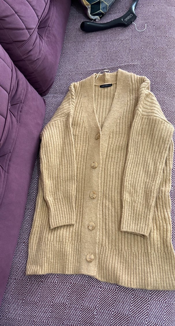 Bej renkli, örgü triko hırka; bol kesim, uzun kollu ve çıtçıtlı önüyle midi boyda. Yumuşak kumaşı günlük rahat kullanıma uygundur.