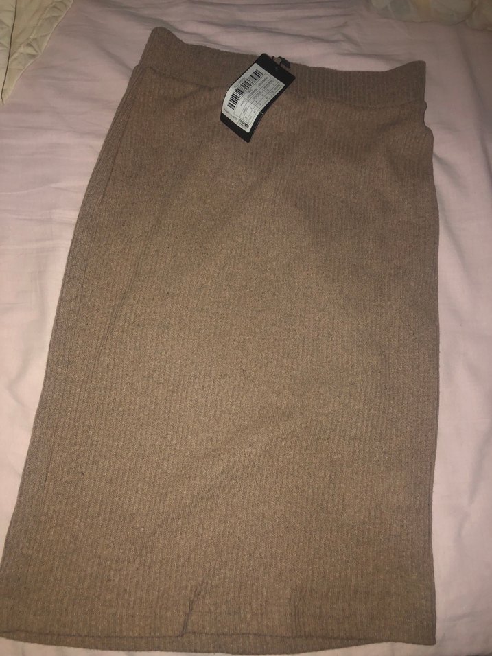 Bej renkli, triko ve yün kumaştan yapılmış, vücuda oturan midi kalem etektir. Rahat ve günlük kullanım için uygundur.