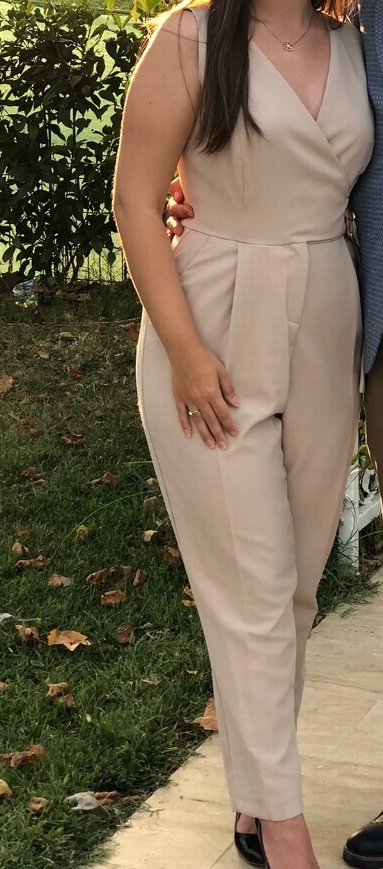 Bej renkli kadın midi tulum, notched yaka ve kuşaklı bel detayına sahiptir. Strappy kollu, regular fit ve sentetik kumaştan üretilmiştir. Düğün ve şık sokak stili için uygundur.