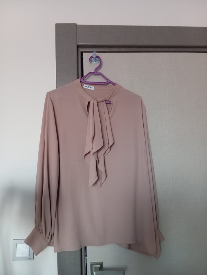 Bej renk, midi boy, uzun kollu ve bol kesim kadın gömleği. İpek gibi kumaştan, drapeli halter yakalı, desensiz tasarım. Günlük rahat Paris tarzı için uygun.