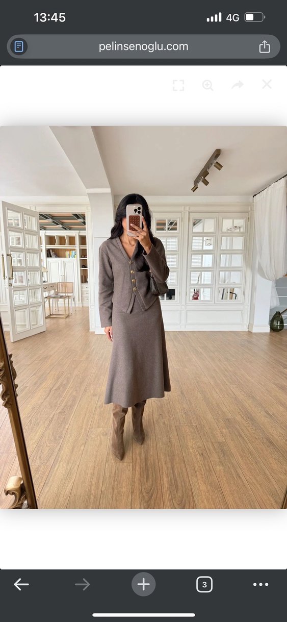 Bej renkte, midi boy ve yün kumaştan, uzun kollu kadın takım elbise. Notched lapel yakalı ve rahat kesimdir. Ofis için şık ve sade bir modeldir.