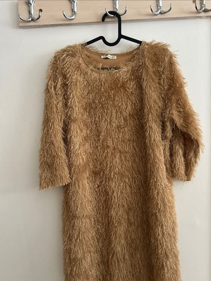 Bej renkli, uzun kollu ve yuvarlak yakalı midi elbise, yumuşak yün ve parlak peluş detaylı dokusuyla rahat bir tarz sunar. M