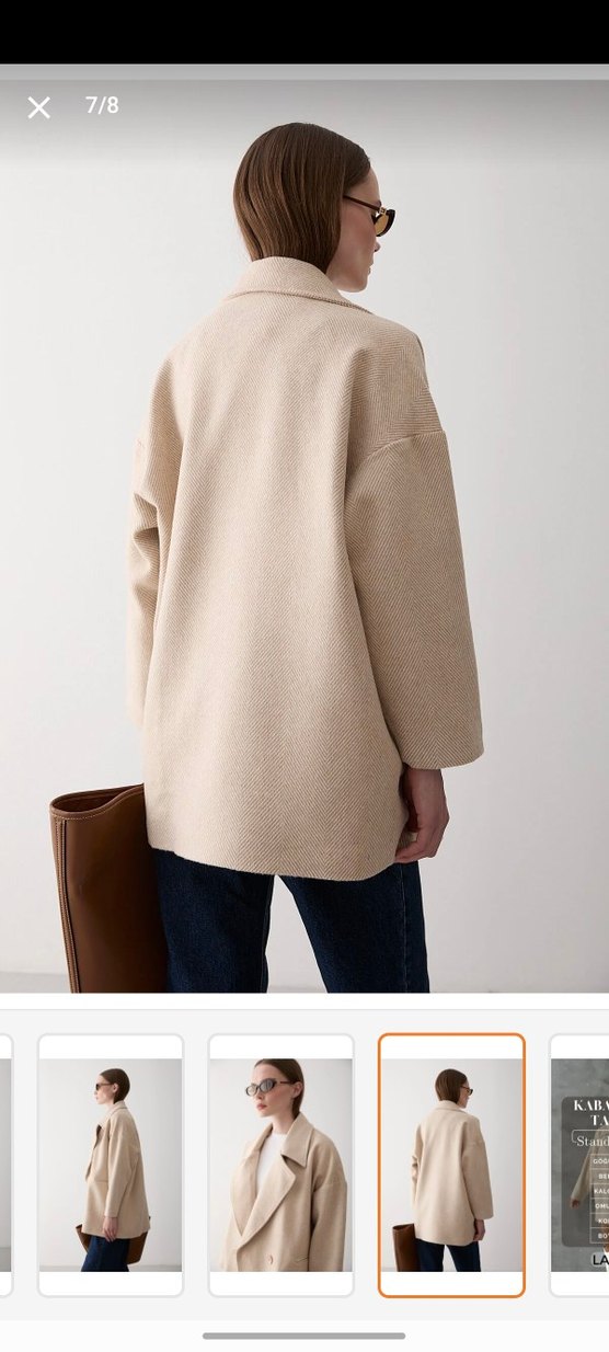 Bej renkli, yumuşak yün kumaştan, uzun kollu ve notched lapel yakalı, bol kesim midi uzunluğunda kadın kaban, günlük kullanıma uygun rahat şıklık sunar.