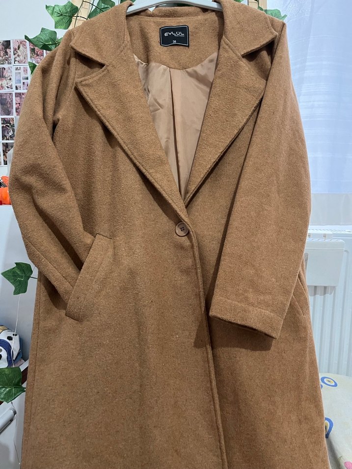 Bej renkli yün kaban, notched lapel yaka, uzun kollu ve düğmeli ön yapıya sahiptir. Regular fit ve midi boyda, rahat sokak stili için uygundur. Parlak ve yumuşak kumaşıyla trend bir görünüm sunar.
