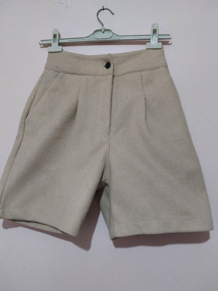 Düz bej renkte, rahat kesim, sentetik kumaştan mini Bermuda şort. Minimalist sokak tarzı için günlük kullanıma uygun, zahmetsiz şıklık sağlar. kışa uygun