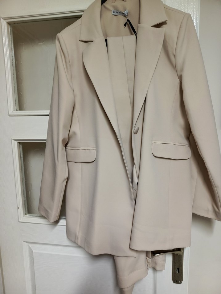Bej renkli mini blazer, kesik yakalı ve düğmeli, ofis için uygun modern klasik tarzda, regular fit kalıpta sentetik kumaştan üretilmiştir. takım pantolonlu etiketi üstünde sadece denendi