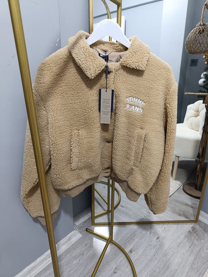 Bej renkli, kısa boylu, yumuşak peluş kumaştan yapılmış, düzensiz yakalı ve bol kesimli kadın ceket. Uzun kollu ve ön ceplidir, hafif baskılı logo detaylıdır.