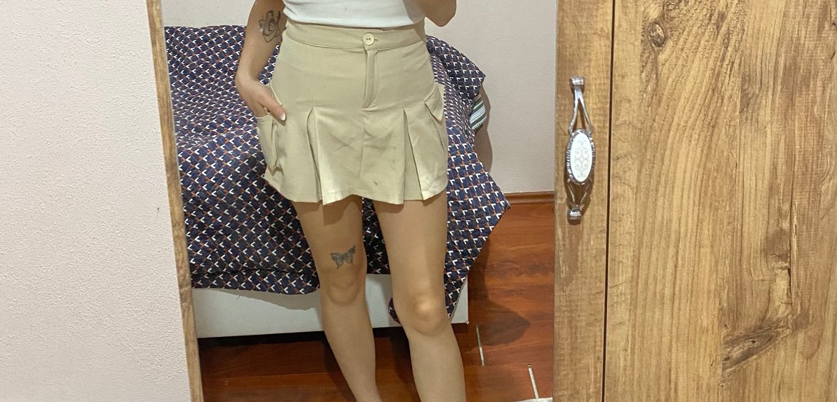 Bu bej renkli, pilili ve düğmeli, sentetik yumuşak kumaştan yapılmış, günlük kullanıma uygun kadın mini etek.