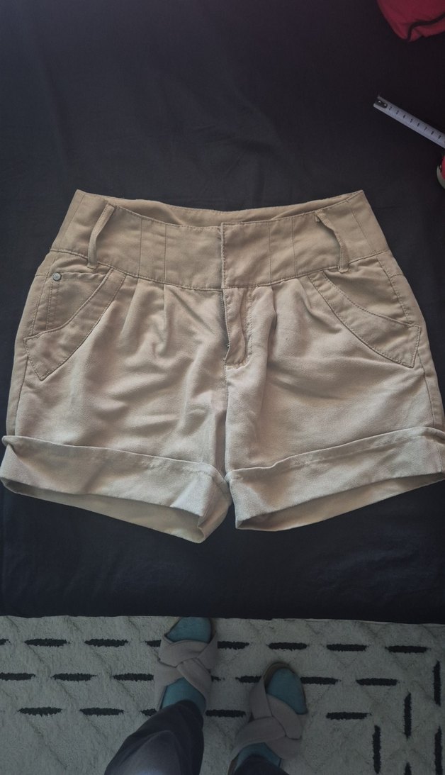 Bej renkli, pamuklu kumaştan yapılmış, bol kesim mini şort. Günlük kullanım ve sokak stiline uygun rahat tasarım. beli 35 cm boyu 34 cm