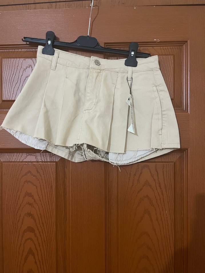 Bej renkli, pamuklu kumaştan yapılmış, pilili ve bol kesim kadın mini şort. Günlük sokak modasına uygundur.