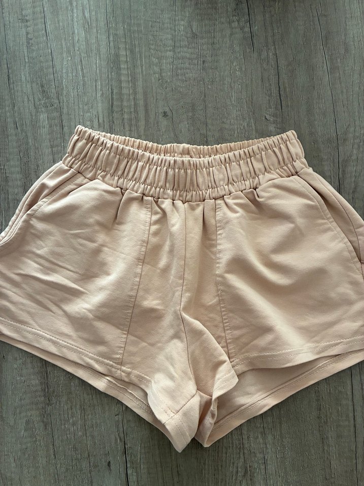 Bej pamuklu mini şort, rahat kesim ve lastikli bel bandıyla günlük sokak stiline uygun. Konforlu ve sade tasarım.