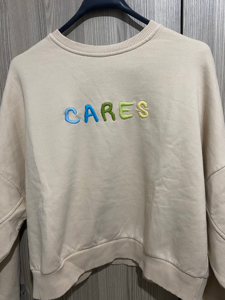 Bej renkli, bol kesim, yuvarlak yakalı ve uzun kollu sweatshirt. Önünde renkli nakış 'CARES' yazısı bulunur, yumuşak ve sıcak kumaştan üretilmiştir. S bedendir oversize olduğundan M bedene de uyumludur. Hiç giyilmemiştir
