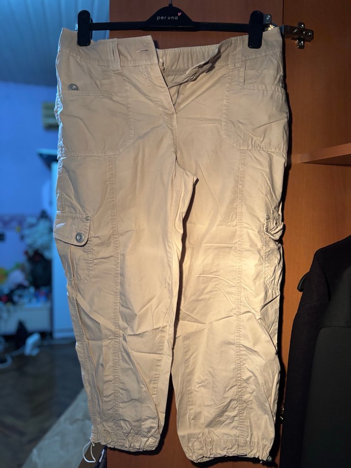 Bej naylonumsu kumaştan, kemerli ve bol kesim midi boy kadın pantolonu. Sokak stiline uygun, rahat ve dış mekan kullanımı için ideal.