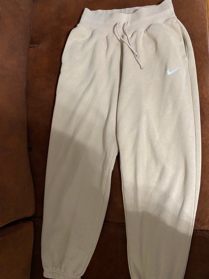 Rahat kesim, orta boy bej eşofman altı, yumuşak ve sıcak kumaştan. Belde bağcıklı, Nike logosu ile günlük sokak stili için uygun. Yalnızca bir kez giydim,S/M beden uyumludur. İnternette güncel fiyatı 2700TL’dir.