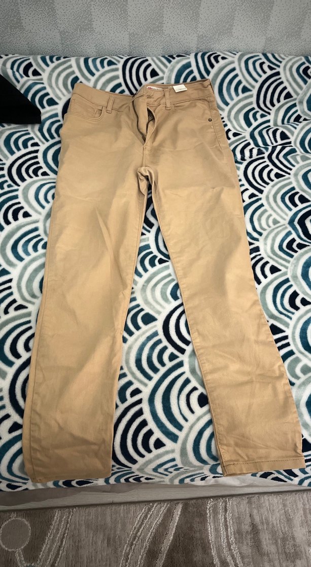 Bej renkte, normal boyda, düğmeli kadın kumaş pantolon. Düz kesim ve sentetik kumaştan üretilmiştir. Günlük kullanıma uygundur.