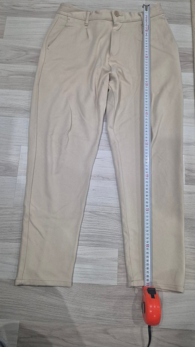 Düz desensiz, elastik bel bantlı, bej renkli kadın kumaş pantolon. Günlük rahat kullanım için uygundur.