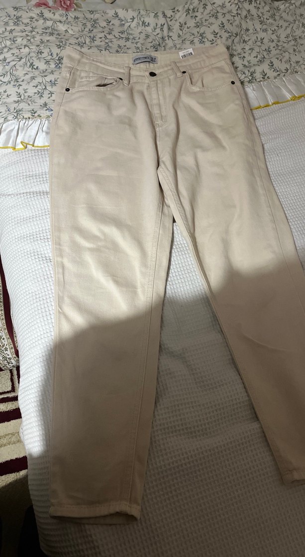 Bej renkte, normal kesim ve midi boyda kadın pantolonu, yumuşak sentetik kumaştan üretilmiştir. Minimalist ve desensiz tasarımıyla günlük rahat kullanıma uygundur.