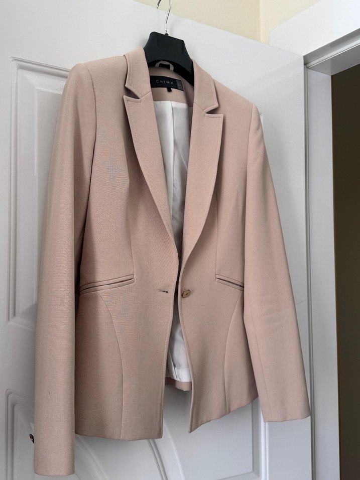 Bej renkli, uzun kollu ve düğmeli kadın blazer. Belden oturmalı kesim, ofis ortamına uygun şık bir tasarım.