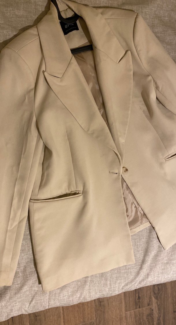 Bej renkte, düğmeli ve uzun kollu kadın ofis blazeri. Satenimsi parlak kumaştan, klasik ve desensiz tasarıma sahip, midi boyda ve normal kesim.