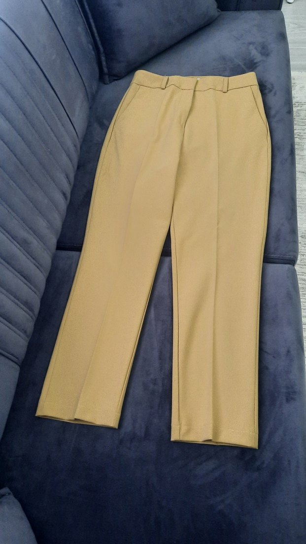 Bej renkli, regular fit ve midi boy kadın kumaş pantolon. Ofis kullanımı için uygun, düz desensiz ve kemer halkalı, şık ve sade tasarım.
