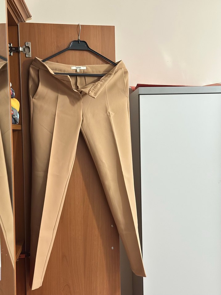 Bej renkli, ve midi boyda kadın kumaş pantolon. Ofis için uygun, ipeksi dokulu ve desensiz tasarıma sahip.