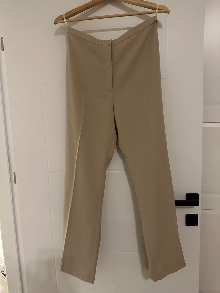 42 beden Bej renkli, ipeksi kumaştan yapılmış, düz kesim ve midi boy kadın ofis pantolonu. Rahat ve şık bir görünüm sunar.